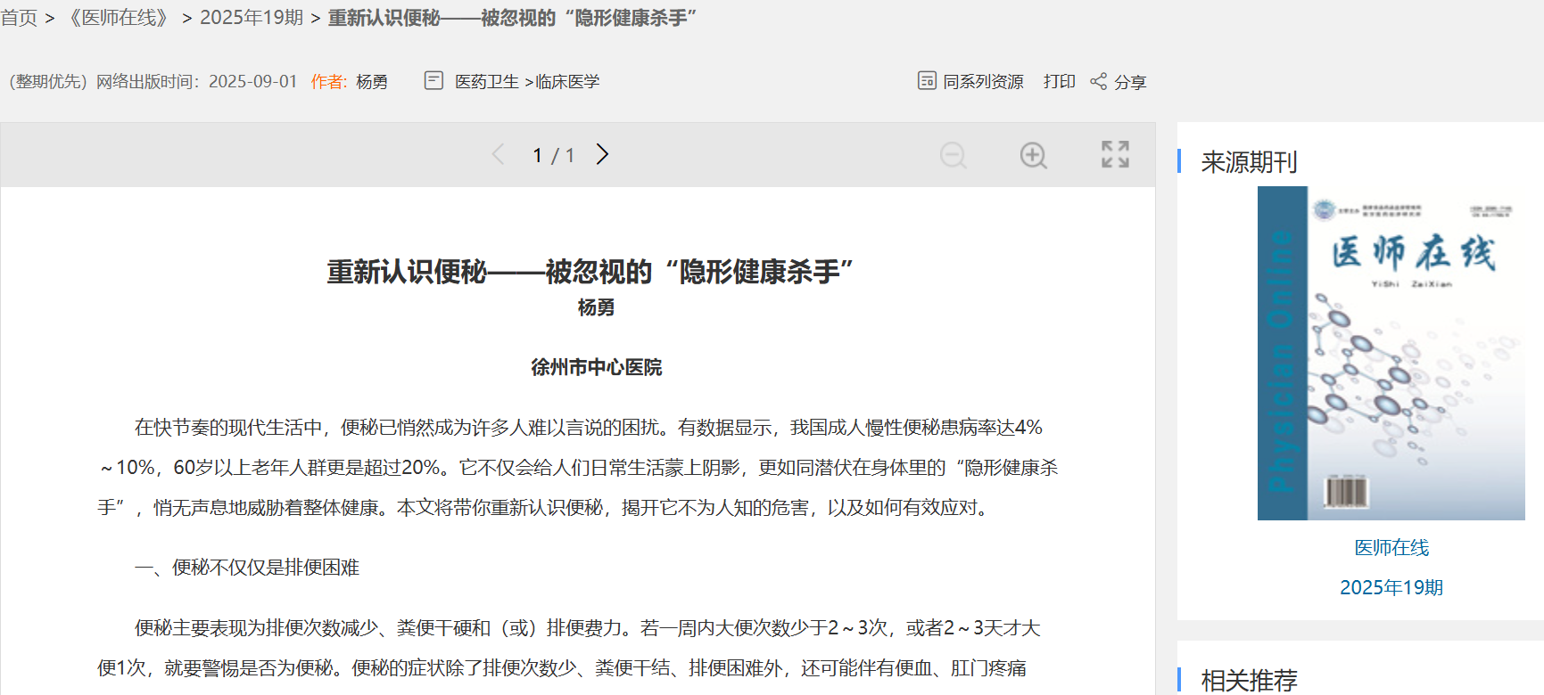 近日,徐州市中心医院在国家级医学期刊《医师在线》发表题为《重新认识便秘—被忽视的“隐形健康杀手”》的专题文章,系统梳理便秘对肠道、心脑、内分泌等多系统的潜在危害,介绍了综合性防治策略,包括聚卡波非钙的作用机理与适用人群。该文通过权威医学平台向公众传递肠道健康知识与科学防治理念,引发广泛关注。