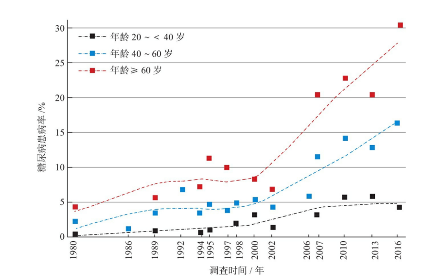 根据《中国糖尿病地图》,各年龄段人群2型糖尿病患病率自1980年以来均呈现上升趋势;40岁以下年龄段人群,2型糖尿病患病率相对平滑并缓慢上升,但2000年以后有加快趋势;40~59岁和60岁及以上人群,20世纪90年代和21世纪00年代初趋势曲线出现波动,但2000年以后出现快速上升,60岁以上年龄段组增长速度更快。